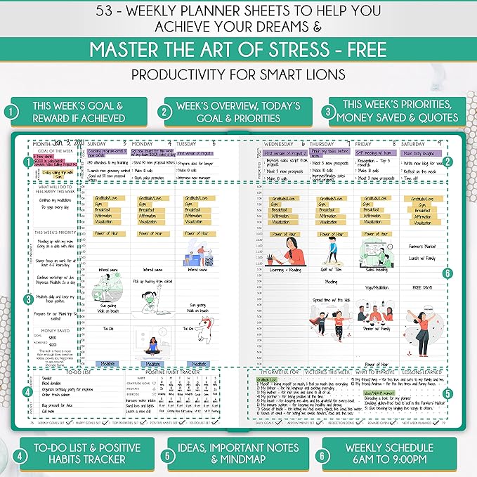 - LIFE PLANNER - A5 Size, 212 pages of life transformation, 53 weekly, 12 monthly planning overviews & reflection, 22 dotted journal pages, habit trackers, mind maps, morning & evening routines, inner pockets, pen holder & gift box