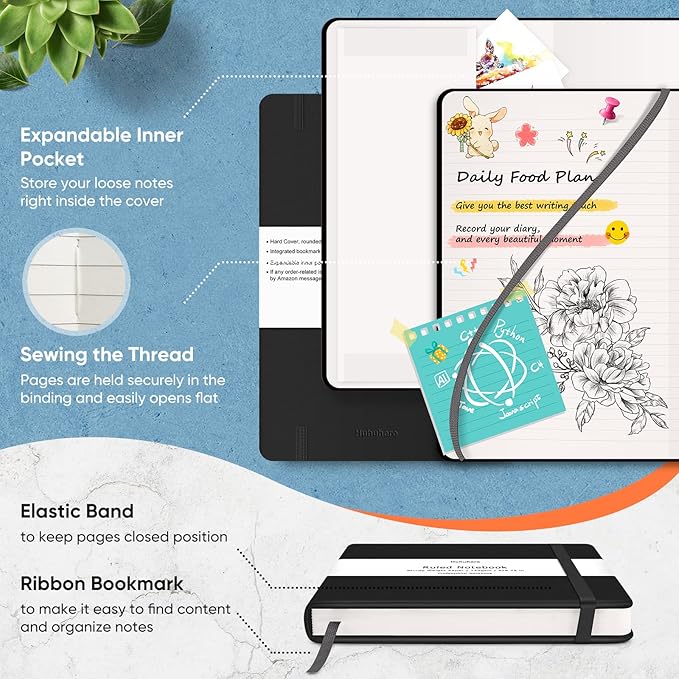 - Expandable Pocket + Elastic Closure Band+ 1 Ribbon Bookmark - The elastic band is strong and the page marker comes in handy. It has a handy-dandy pocket in the back to keep business cards, notes, receipts and other small paper items. Huhuhero notebook journal will provide comfortable smooth writing experience, great for bullet jounaling, studying, journaling, note taking, daily planning, drawing. Premium college supplies, office supplies, art supplies.