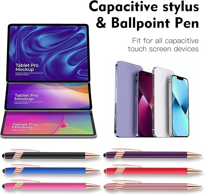 12 PCS 2 in 1 Stylus Ballpoint Pen with Stylus Tip, 1.0 mm Black Ink Metal Pen Stylus Pen for Touch Screens (Rose glod & 6 Colors)