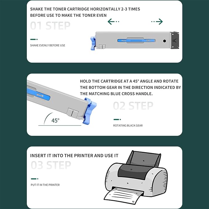 - Installation method: Take out the old toner cartridge of the corresponding color, shake the cartridge horizontally 2-3 times to make the toner uniform, and put it into the printer to use