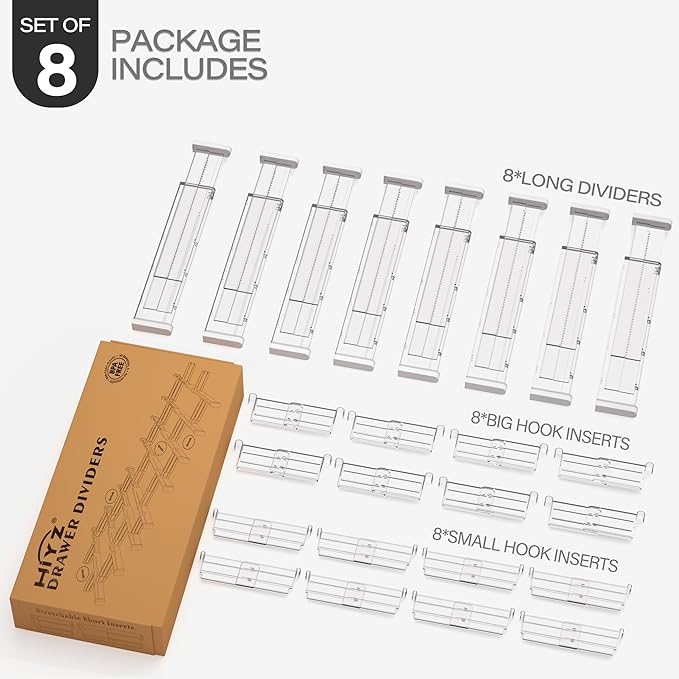 HiYZ Expandable Drawer Dividers with Inserts - Adjustable Drawer Organizers Separators for Kitchen, Bedroom, Dresser, Office, 8 Long Dividers(12.6-22.8 IN) with 16 Inserts(3.9-7.1 IN) - Clear