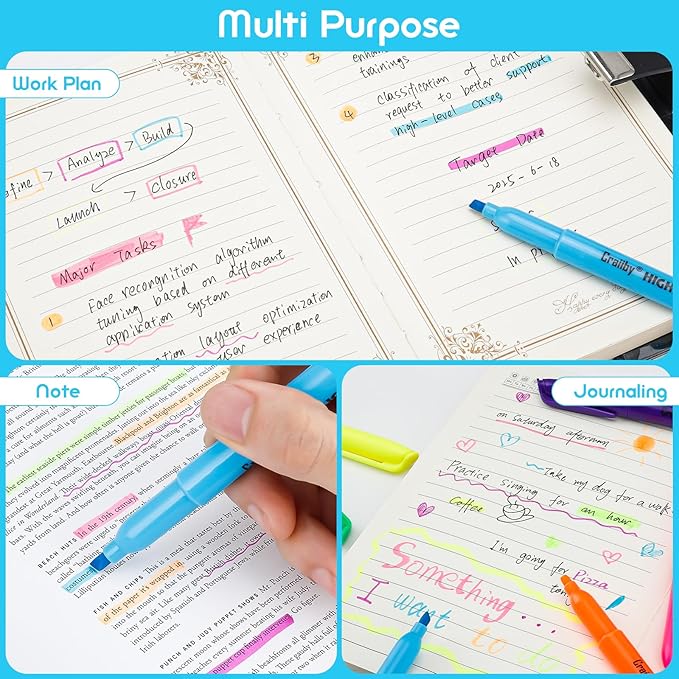 - Dual-Line Chisel Tip – Fine & Broad: Each highlighter features a durable chisel tip that creates both 1mm fine lines and 4mm broad strokes. Perfect for highlighting, underlining, annotating, and color-coding notes or documents.