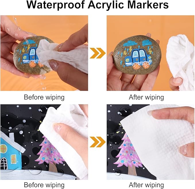 - Upgraded Waterproof and Easy to Use: Our new acrylic paint set do not require shaking or pressing the pen tip to release ink—just open the lid and start using them directly! Coloring Markers set are made with water-based ink, which providing a smooth, consistent application with even ink flow for a more effortless painting experience. The resulting artworks are brightly colored, waterproof, fade-resistant, and sun-resistant, making them ideal for long-term preservation.