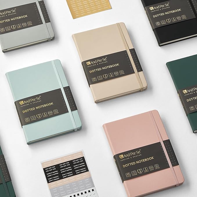 &And Per Se Dotted Journal Notebook (5 Packs), A5 Hardcover Leather Dotted Journal, 160 Pages 100 gsm Thick Paper, 3 Sheets of Stickers Included- 5.7'' x 8'' (Green