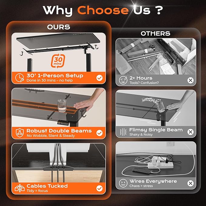 - 【Whisper-Quiet Operation】Powered by a robust yet quiet motor (operating at less than 45 DB), the wide deep desk brings smooth height adjustments without disturbing your household or office environment. This standup desk for home office is ideal for keeping focus and slient