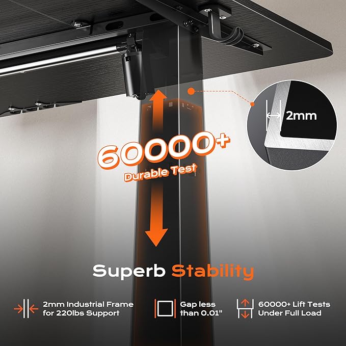 - 【Built to Last with Exceptional Stability】The industrial-grade steel frame and T-shaped design of the stand up desk support up to 220 lbs, ensuring stability and reliability for years to come. Paired with a durable motor, this home office desk is designed to meet the demands of your dynamic workday