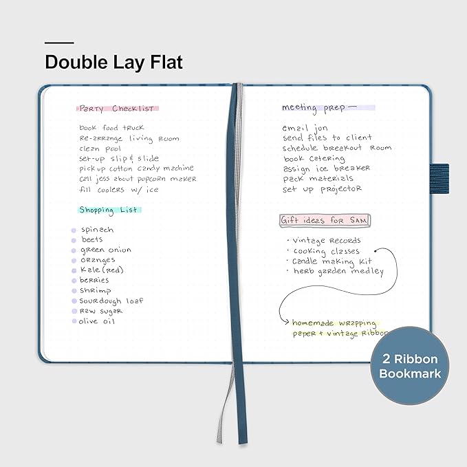 - 180° LAY-FLAT DESIGN: The lay-flat design allows for easy writing and ensures that you can utilize every page efficiently. Journaling, note-taking and planning has never been easier! 2 Bookmarks to help you find important content faster