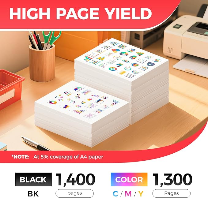 - High-Yield: up to 1,400โฌ pages per 045/045H Black and 1,300 pages per 045/045H Color (Total 5,300 pages, 5% coverage).