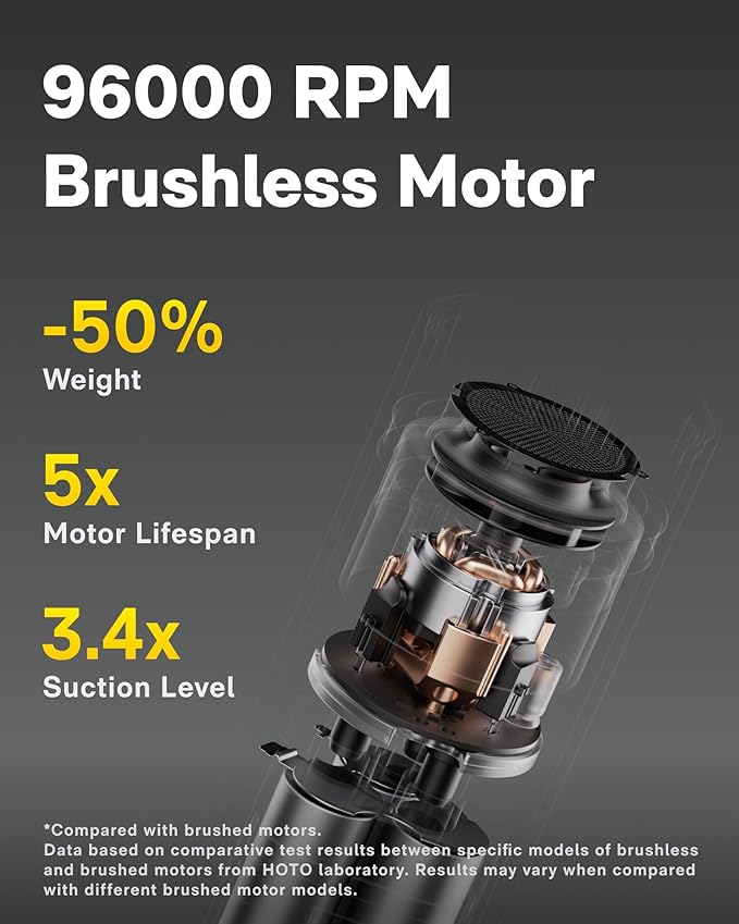 - NO MORE INVISIBLE STUBBORN DUST: Equipped with a 96,000 RPM brushless motor, the HOTO handheld car vacuum cleaner delivers powerful and sustained 20,000 Pa suction, effectively removing stubborn dust and debris from car crevices, desktops, computers